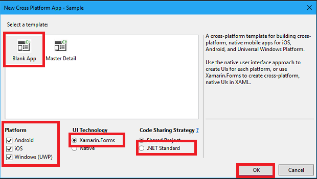 Now, select Blank App >> Platforms(Android, Universal Windows Platform, iOS) >> Xamarin.Forms >> .NET Standard and press OK.