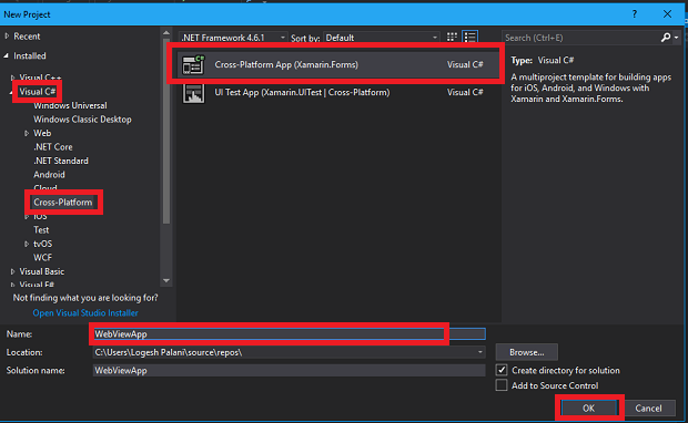 You can create a new Xamarin.Forms app by going to File >> New Project >>Visual C# >>Cross Platform >> Cross Platform App (Xamarin.Native or Xamarin.Forms ) and give the app name and solution name. Then, click OK.