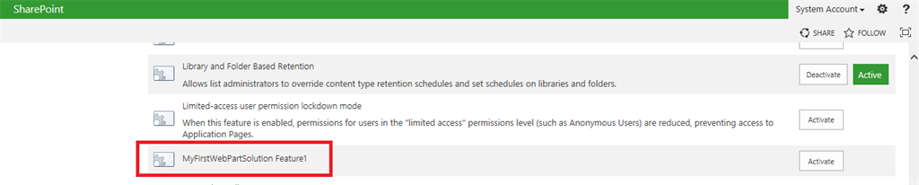 Go to your custom web part feature. Here I have created MyFirstWebPartSolution Feature.