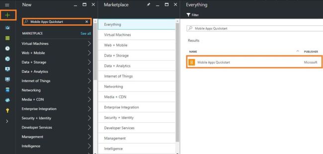 Click +NEW and type Mobile Apps in Search the marketplace. Select Mobile Apps Quickstart.