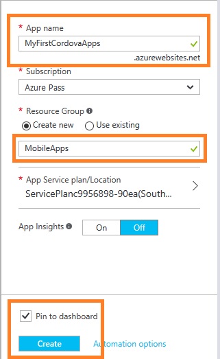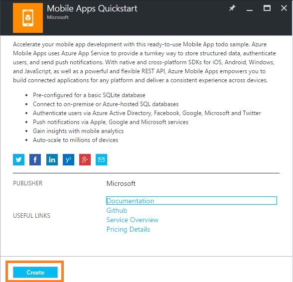 In the Mobile App Quickstart account blade, specify the desired configuration for the Mobile App account Name & Resource Group. Click Create Button at the bottom of the screen to create the Mobile App Quickstart.