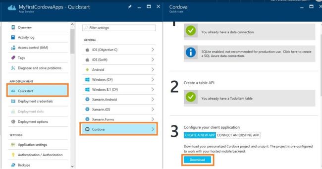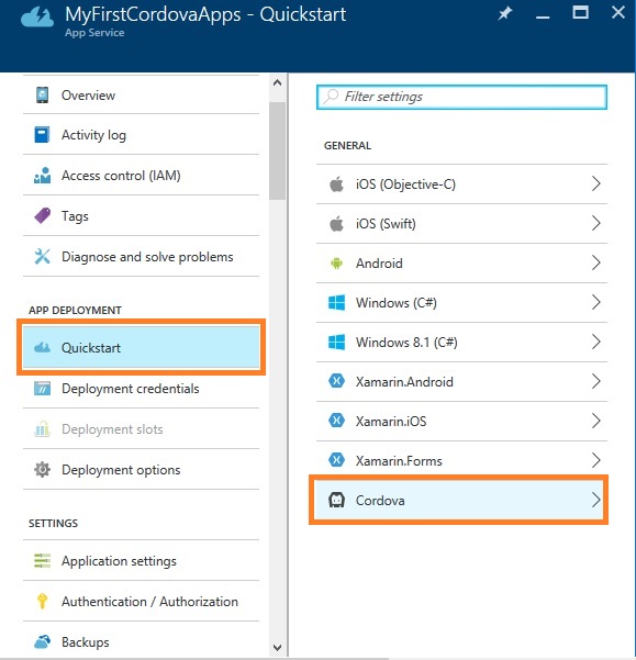 In the Settings blade for the new Mobile App backend, click Quick start and Select Cordova.