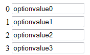 - HtmlContent += "<tr><td>" + i + "</td>" + "<td><input type='text' class='testoption' name='1' value='optionvalue" + i + "'/></td></td>";