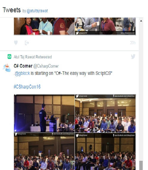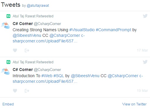 - <a class="twitter-timeline" href="https://twitter.com/atultajrawat" data-widget-id="707173253450608640" data-screen-name="CsharpCorner">Tweets by @atultajrawat</a>