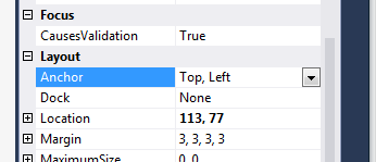 To use anchor property select the component and go to property. Under layout there is Anchor = Top, Left. Change these positions according to your requirement.