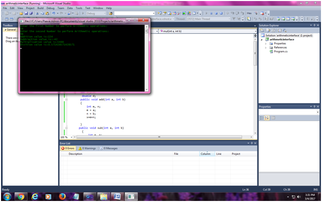 - To perform arithmetic operations of addition, subtraction ,Multiplication and division, we use interface concept in C# programming language.