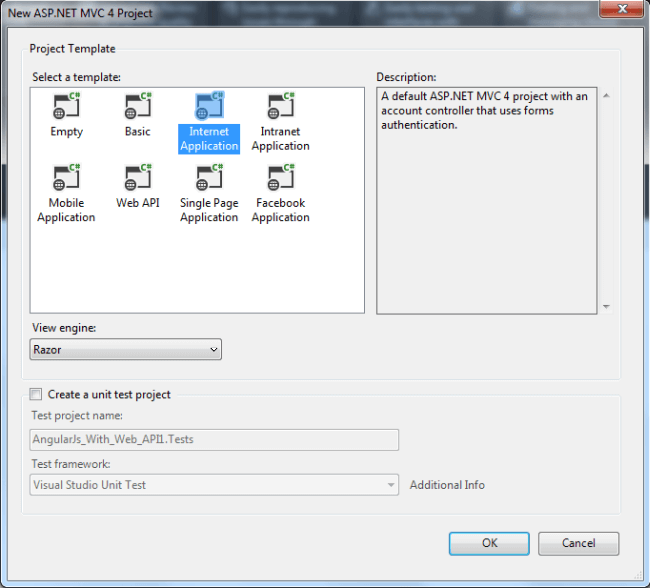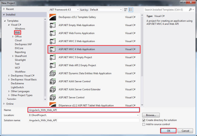 Click on Web from the left-side panel and select ASP.NET MVC4 Web Application. Give it a name and click OK.