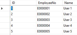 Here “ID” column is for storing record id as similar to Serial No of any entry made. “EmployeeNo” column is used to store the alphanumeric auto increment id. “Name” stores the name of the Employee.