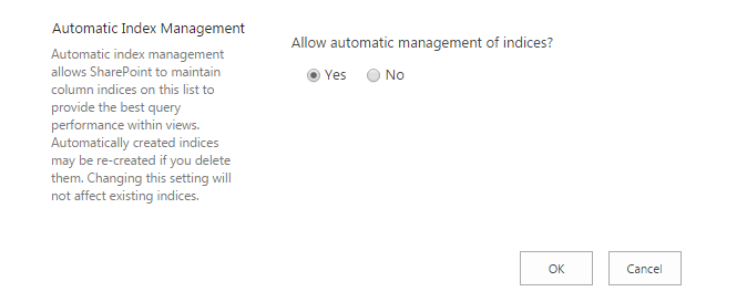 Microsoft SharePoint 2016 released a feature for managing large lists in SharePoint 2016. This feature automatically indexes the columns of the list based on the following: