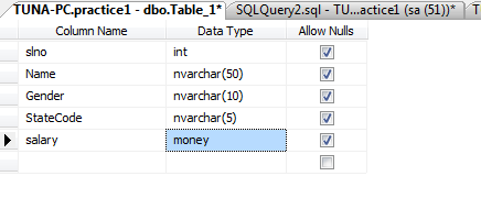 Here i am Creating a table as 'Employee1' which contain following colums.