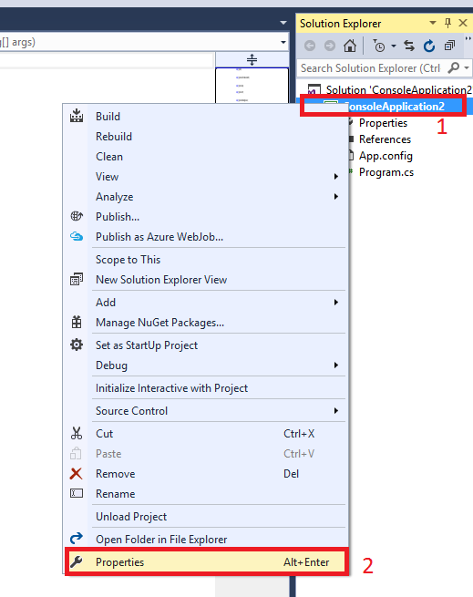 Select the project from the Solution Explorer window for which we want to change the C# Language version. Right click on the respective project.
