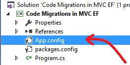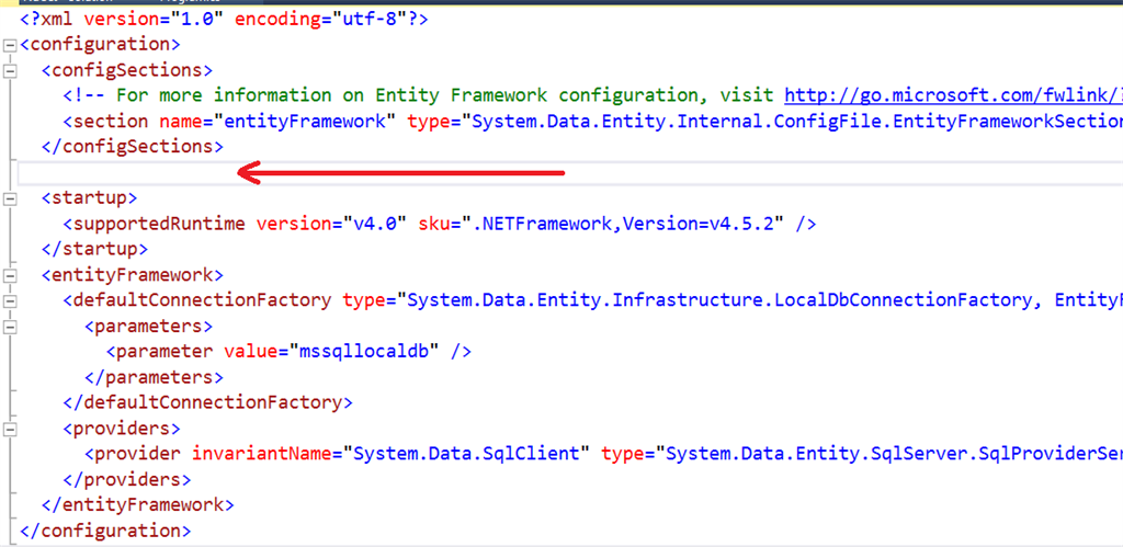 App.config file will be like this. See the space below the configSections. We’ll add our customized connection string to force our database to be create into our SQL Server.