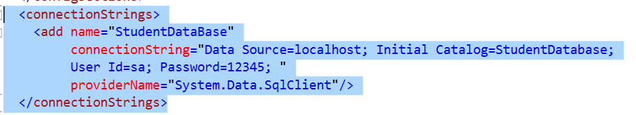 - Initial Catalog = StudentDatabase: Initial catalog is the name of the context class what you’ve created into your code classes. Here I’ve set the context class name = “StudentDatabase”.