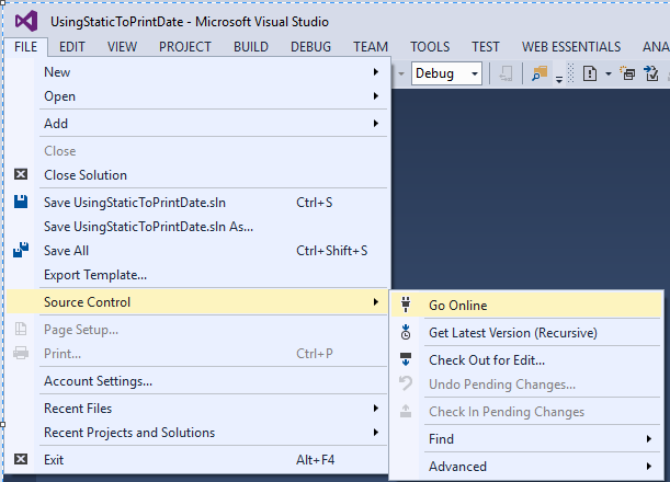 Now to go online on TFS click on File Menu