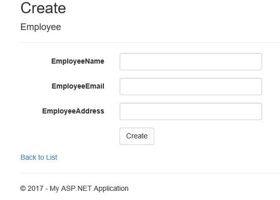 - Now, run your Application and enter the data to your Create View and click on Create button, based on which the data will be automatically saved to the database and will be shown on Index View.