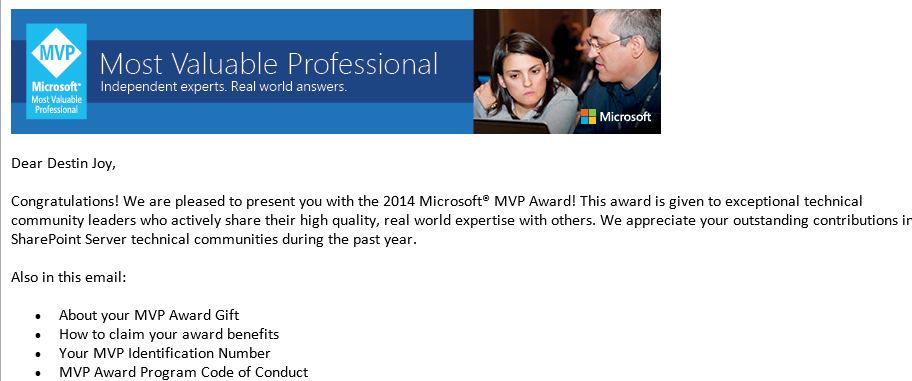 I'm ecstatic and delighted to share with you the following email received from Microsoft saying I've been awarded with MVP. I want to say huge thank you to Microsoft for giving me the award but I also want to thank YOU the community as without you guys none of this would be possible.