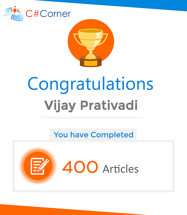 C# Corner congratulates Vijay Prativadi on publishing 400 articles on C# Corner community. Vijay Prativadi has been contributing since 2011 and achieved 8800+ points and Rank #10. He is one of the topmost frequent and popular contributor of the community.