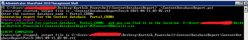 - write-host "Report collected for content database " $CDBName " and you can find it in the location " $output -fore green