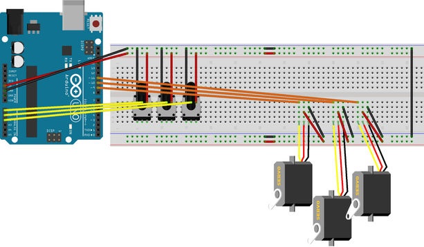 - Connect GND and VCC in the three Potentiometer commonly to the Arduino board.