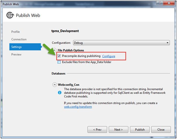 Very important step, just click the file publish option and tick the option that says "Precompiled during publishing".