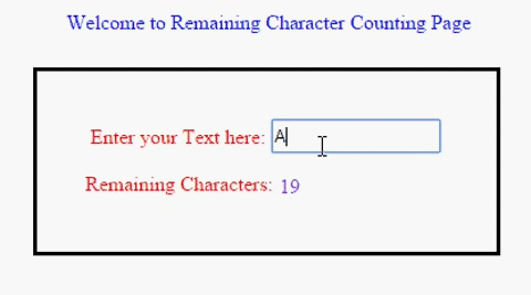 - <p style=" color:blue; width: 323px; z-index: 1; left: 506px; top: 13px; position: absolute; height: 19px; margin-left: 22px; margin-bottom: 12px;"> Welcome to Remaining Character Counting Page </p>