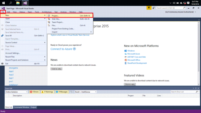 Open Visual Studio 2015, open the file and new project, which is using shortcut keys Ctrl+Shift+N.