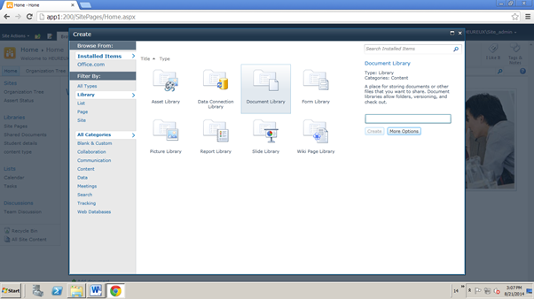 Step13: then go the particular list or library, click document tab from library tool which is in top ribbon, click new Document here you can see you content type.