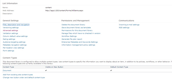 Step2: once the library has created, conform whether content type is enabled for the library, to check go to library setting which is in ribbon then click advance setting under general setting .