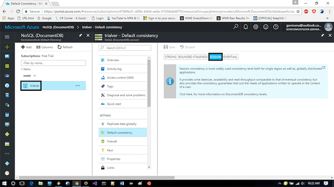 Default consistency of Document DB account is set to "Session". We can change the default consistency in the resource menu.