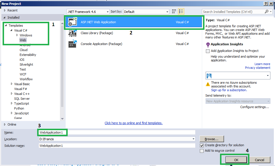 In the "New Project" dialog, select "Templates", Visual C#, then Web and select "ASP.NET Web Application". After that provide the name you want to save and click "OK".