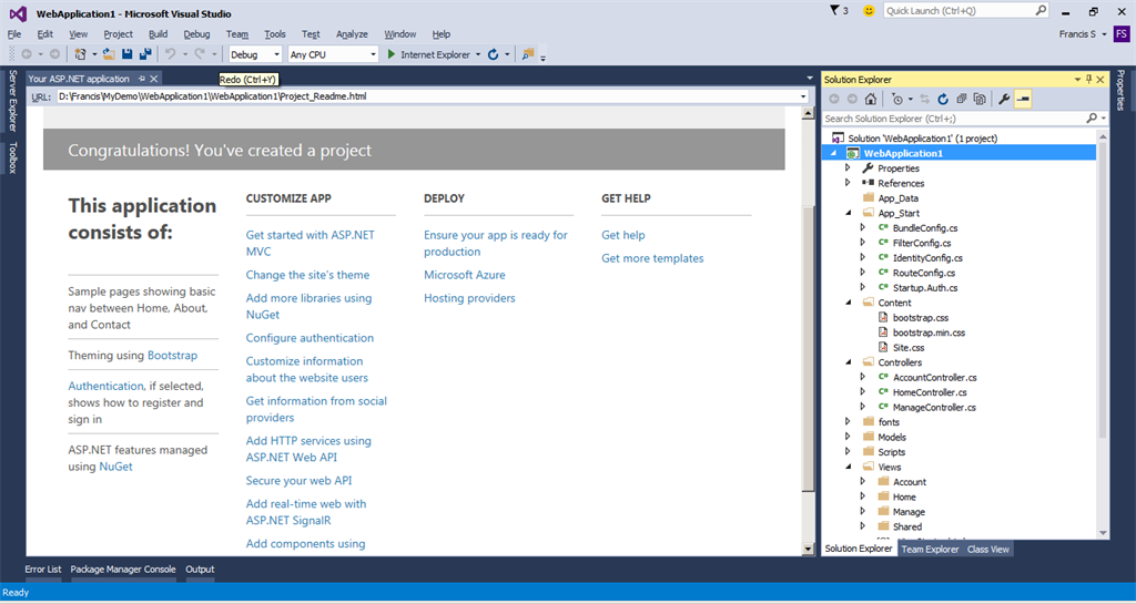 That's it. You have successfully created an ASP.NET MVC Web Project. It will look like below, as you can see, it will consist of all the necessary files to start the development. You can see this in the solution explorer.