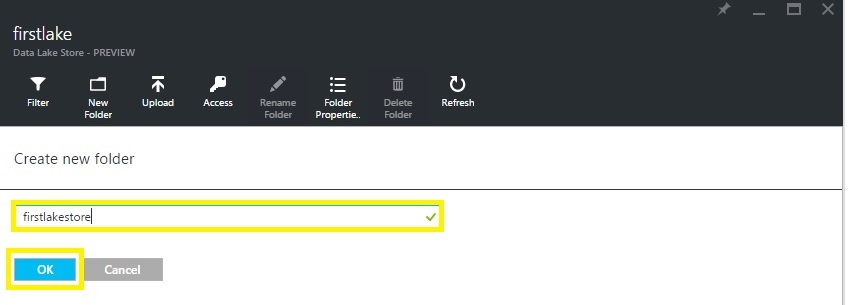 Step 3: Next, in your Data Lake Store account blade, click New Folder.