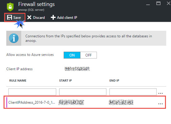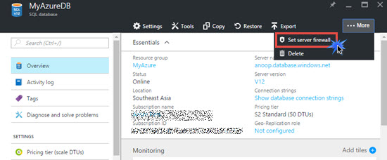 Go to SQL Server database and select your database. Click more links and subsequently click set Server Firewall.