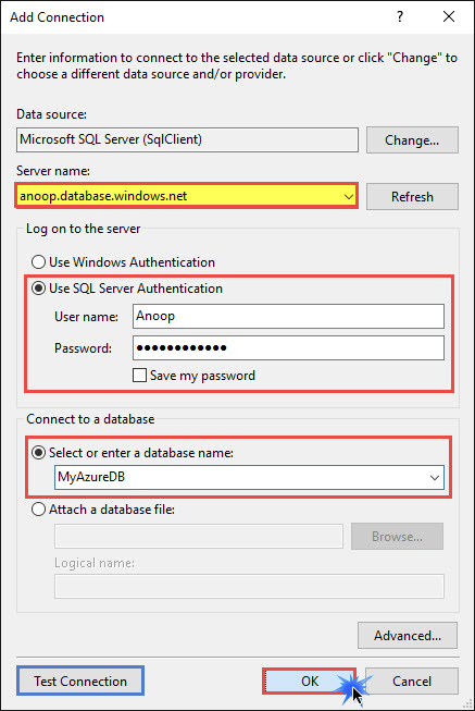 You can also open your SQL Server, fill the Server details and click connect. Cheers! We have successfully connected to SQL Server database, hosted in Microsoft Azure.