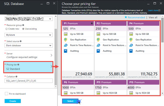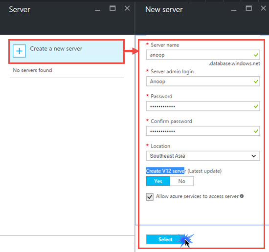Click Configure required settings and click create a new Server on the Server blade. Fill Server name and Server admin login details. Click select.