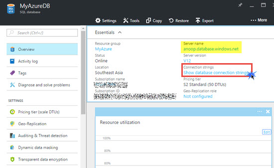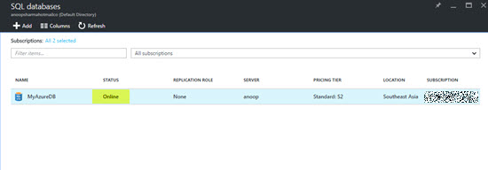 Within a few minutes, you will see an online status in SQL database blade, which means our database is ready for use. Click SQL database name i.e. MyAzureDB.