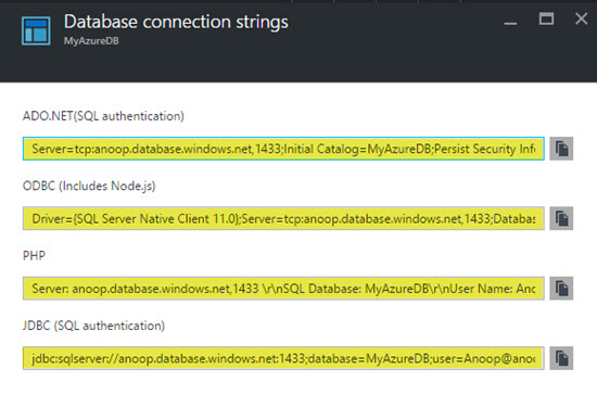 You will get the connection strings for ADO.NET, ODBC, PHP etc. Applications.