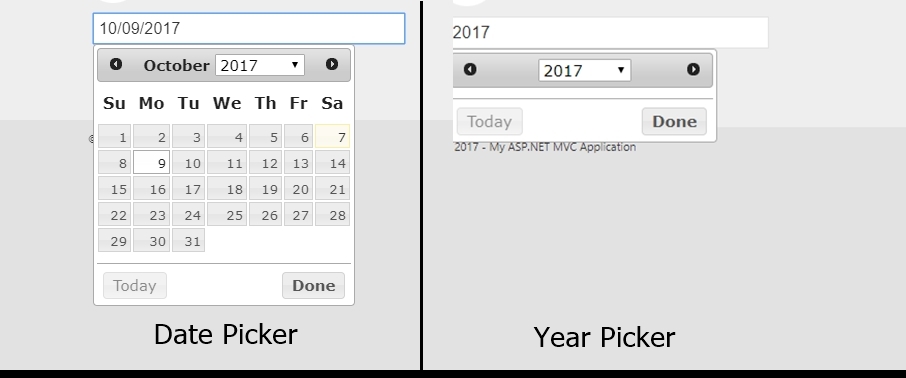 5. Invoke Year Picker when focus on “Year” field using ‘$("#Year").focus()’ event.