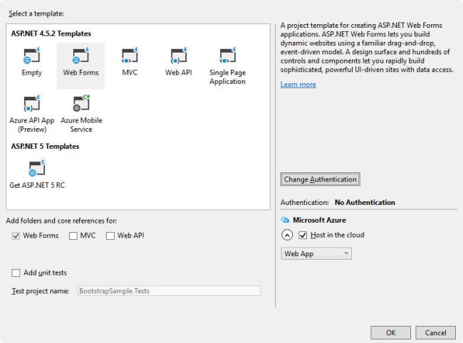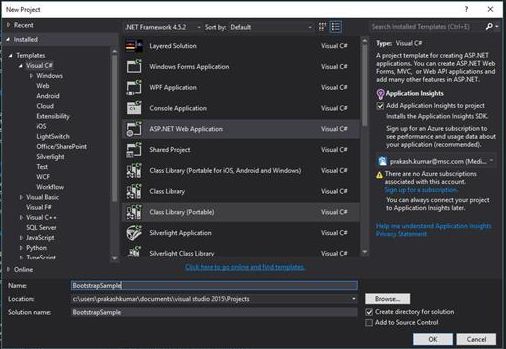 To create a responsive application in ASP.NET Web application, we need to add the bootstrap JS and CSS files manually but in Visual Studio 2015, it is already added with the web application as built-in functionality. In this sample application, we will see how to use bootstrap library for forms and controls.