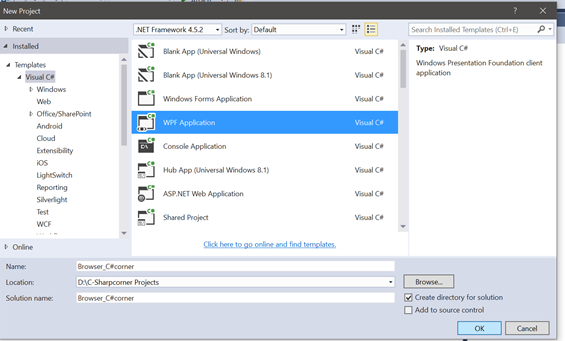 Step 2: Select WPF (Windows Presentation Foundation), name your project and select the location where it has to be saved.