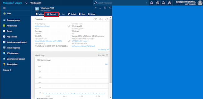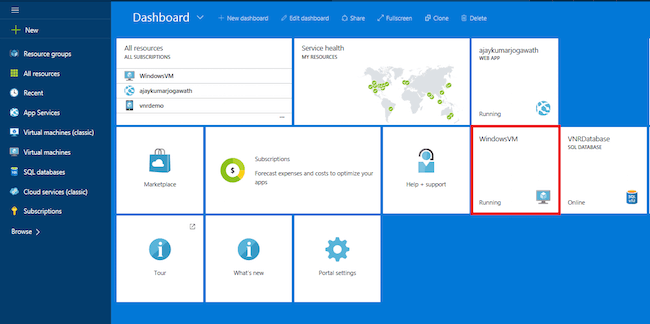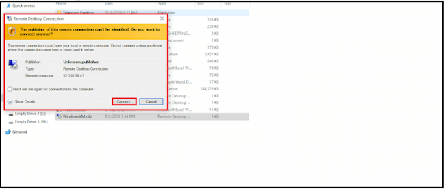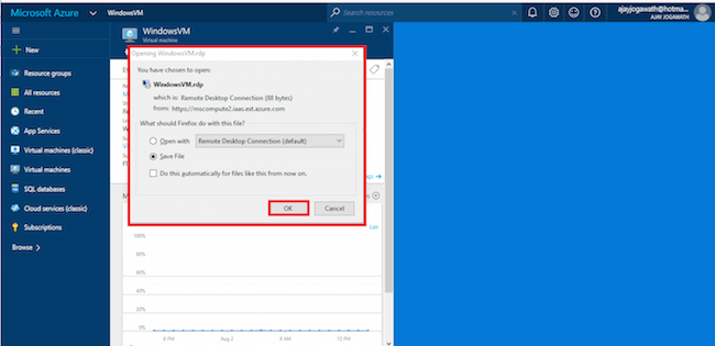 Now, click on the tile WindowsVM (in case, you have given the same name as me), you will able to see an option as connect. Click it and it will ask you to download a remote desktop file. Click save.