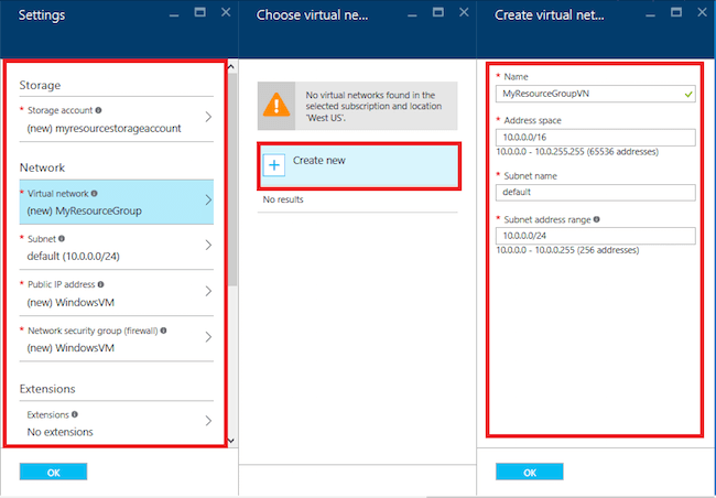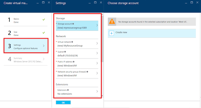In this step, it will ask you to specify a name to the storage account (by default, it takes some name), virtual network & Public IP address.