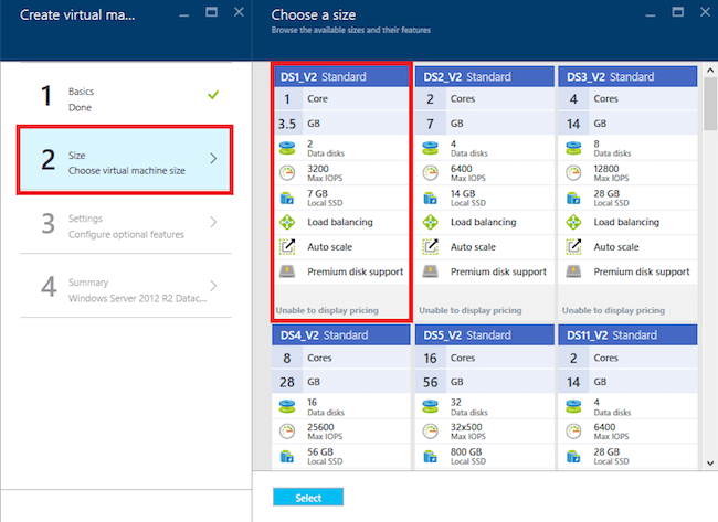 In this step, it will ask you to select the size of the virtual machine and you will be able to see some of the recommended sizes, in addition to the features of the virtual machine.