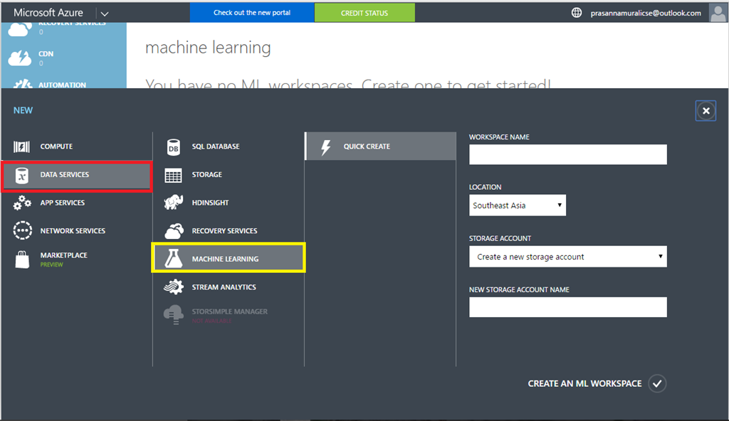 Step 2 - Now on to the home screen of Azure management portal select New -> Data services ->Machine Learning. And the window shown below appears.