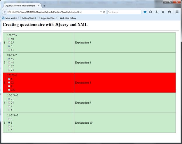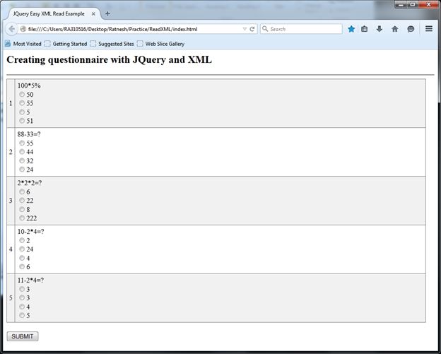 I am just doing some exercise with JQuery. I want to create a dynamic questionnaire with JQuery and XML. Here I want to keep my all questions in a XML file. My application should able to select random questions from the XML file and create html content with Question and its answers with radio buttons. Once user submits his response he should able to see the result and Explanation for each question.