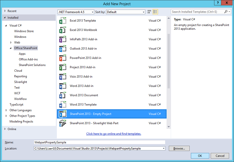 Choose SharePoint 2013 – Empty Project from Office/SharePoint sub menu under Visual C#.