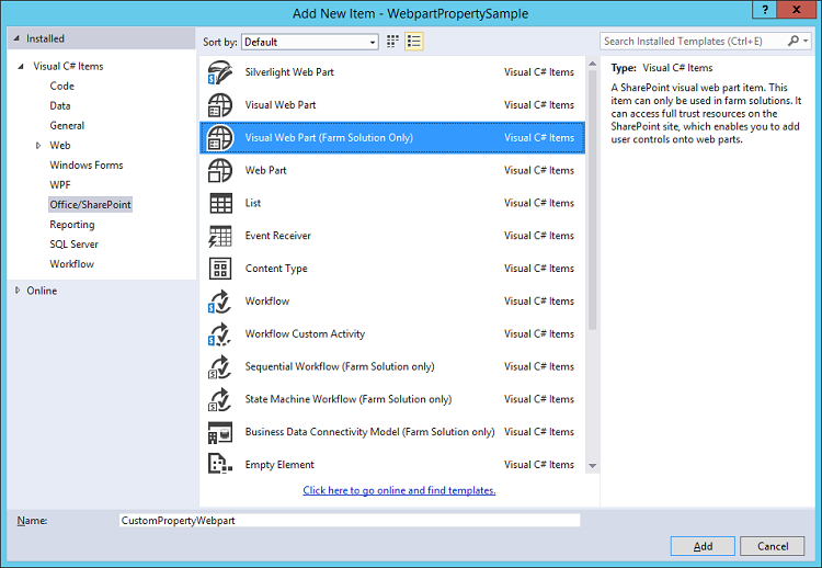 Name it CustomPropertyWebpart and click Add.