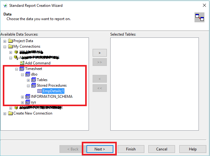 Step 5: Connect to SQL database and Select your Stored Procedure 'EmployeeDetails, and click 'Next'.