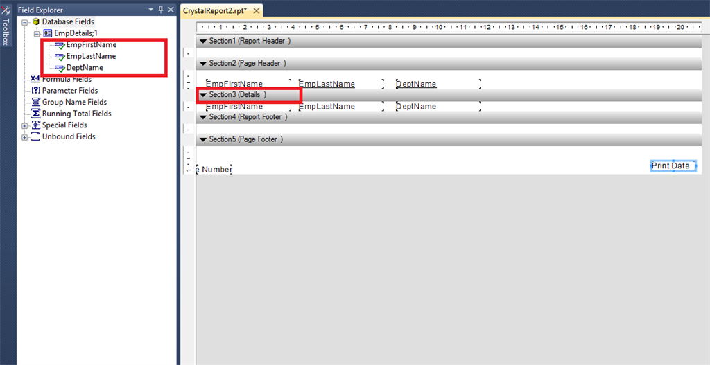 Step 6: Drag and drop Fields from Field Explorer to Report Details Section as shown in below screen.