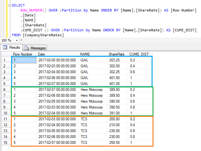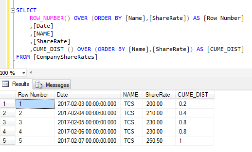 - ,CUME_DIST () OVER (Partition by Name ORDER BY [Name],[ShareRate]) AS [CUME_DIST]